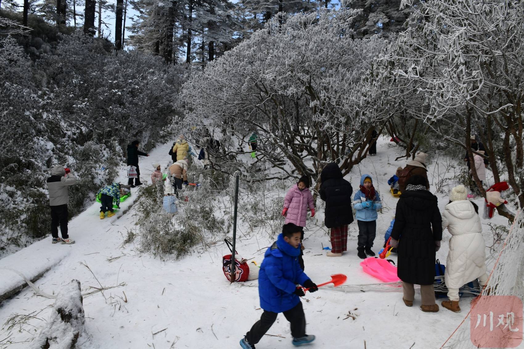 瓦屋山旅客在雪地里游玩。